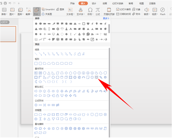 然后回到幻灯片当中,在空白幻灯片当中插入一个心形,单击工具栏插入下的形状。