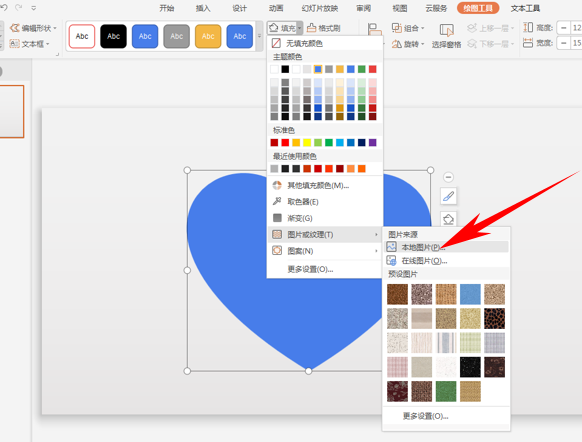 插入一个心形后,单击工具栏绘图工具下的填充,在下拉菜单下选择图片或纹理,然后选择本地图片。