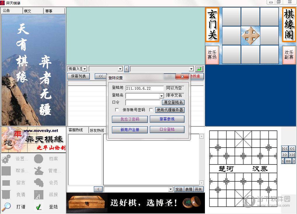 在登陆设置窗口中选择“游客参观”,不用注册即可进入弈天,但是不能说话和对局,只能观战。